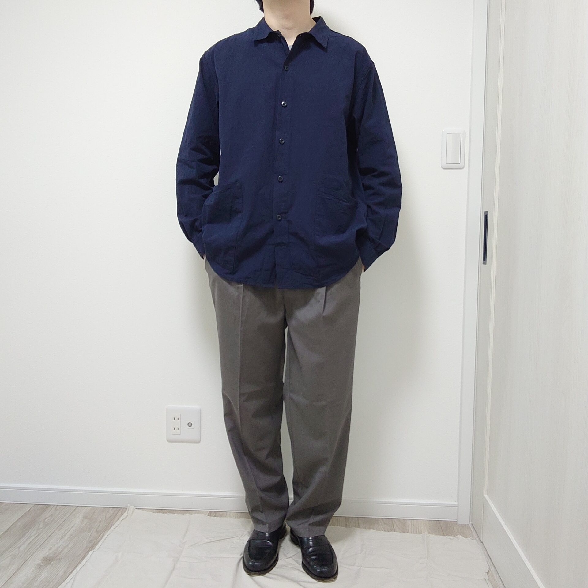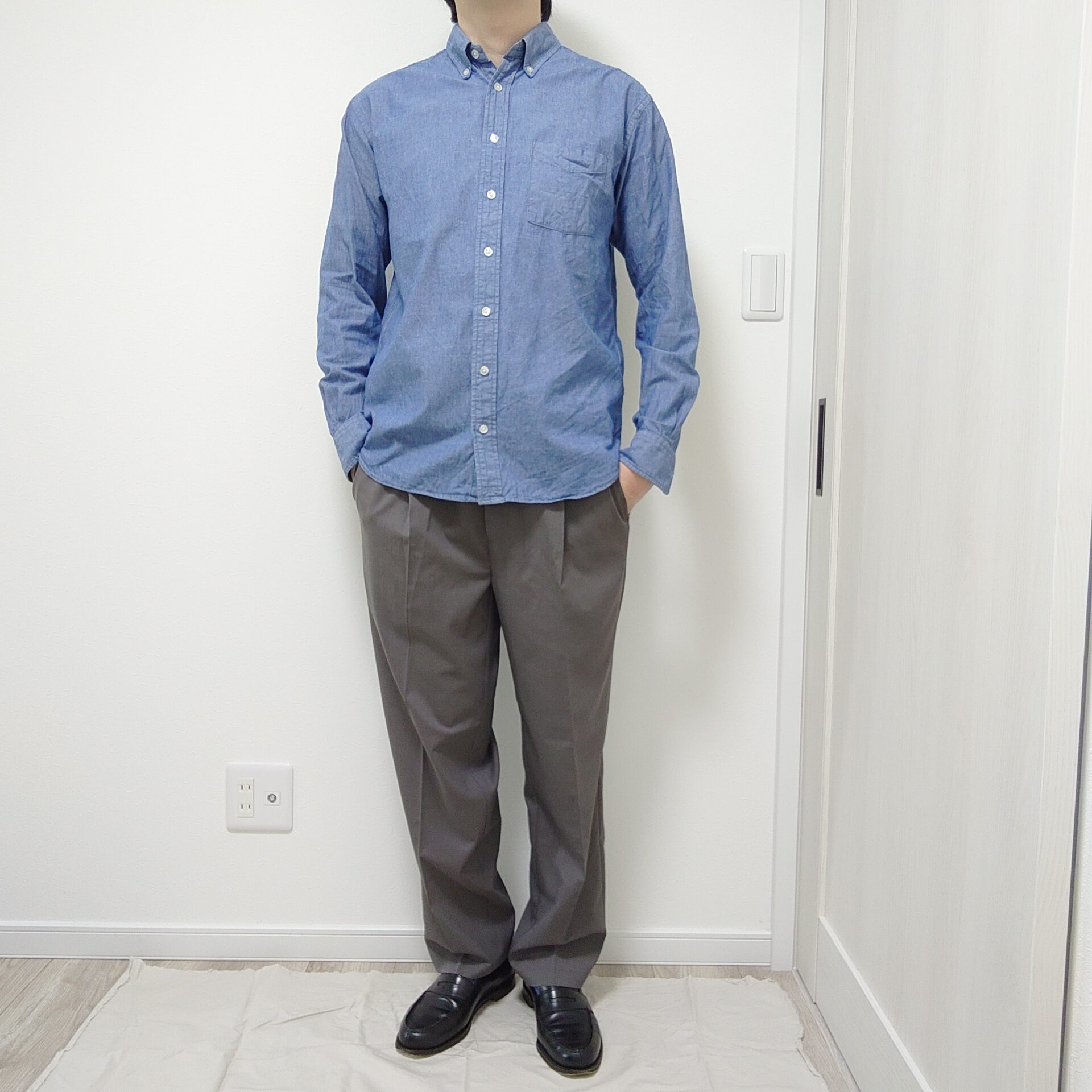 シャツにトロオルマイのコーデです。足元はジャランスリウァヤのローファーを合わせています。1枚目はSEROのシャンブレーシャツ、2枚目はアボンタージのゆったりシルエットのシャツです。