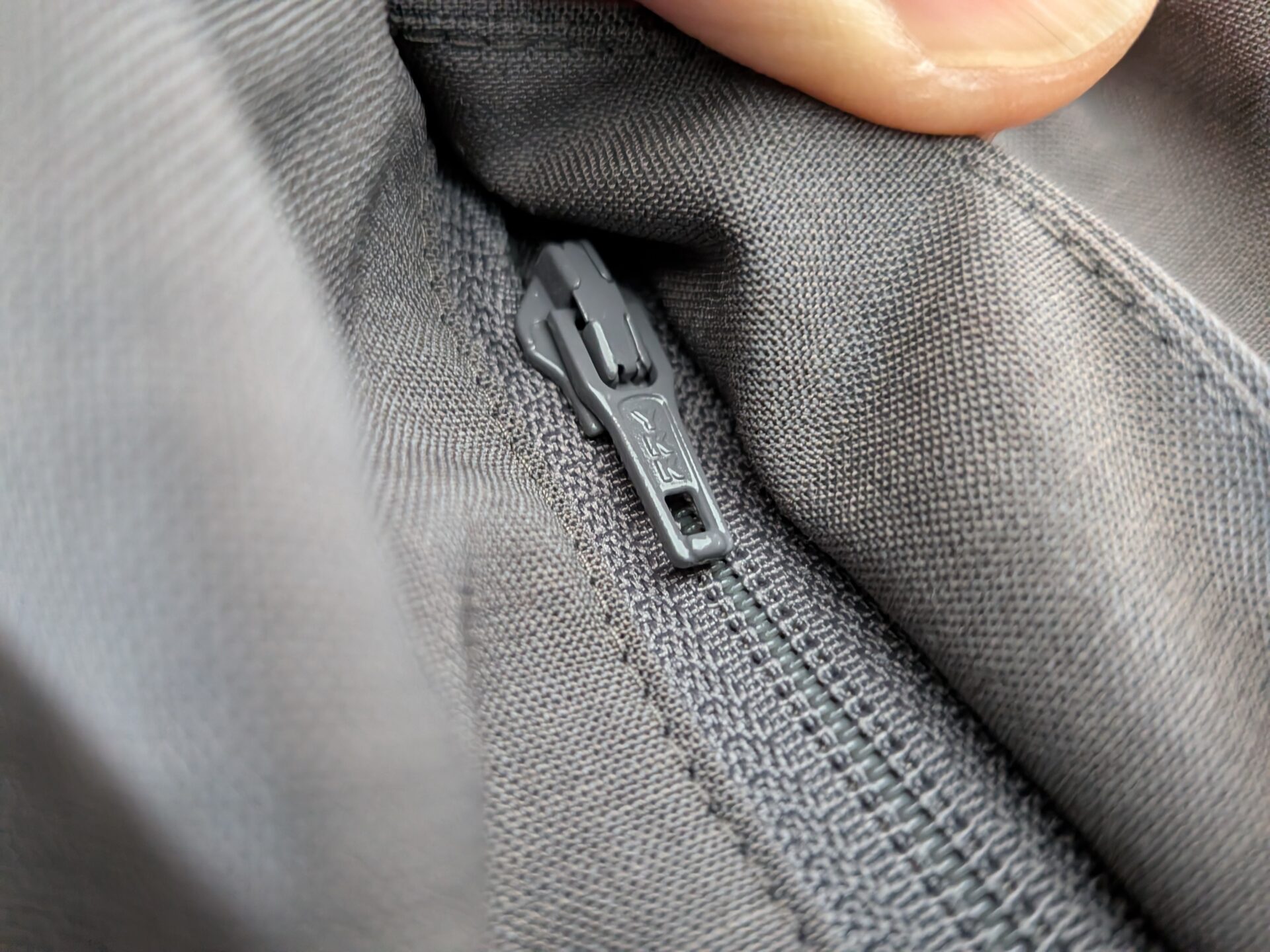 ちなみに前側にはポケットは3つあります。両サイドに通常のポケット、右腰にファスナーポケットがあります(鍵など入れてもよいでしょう)。