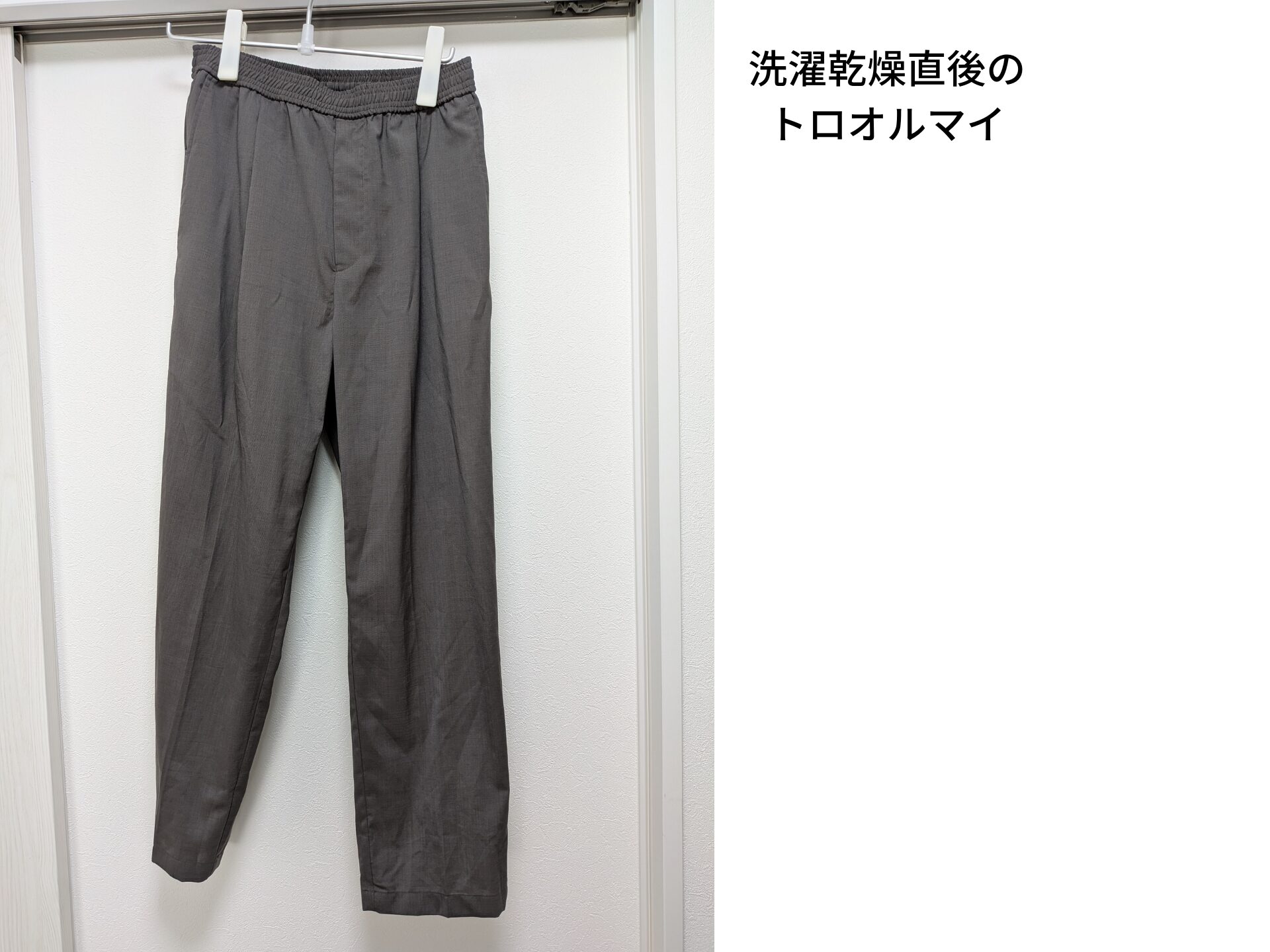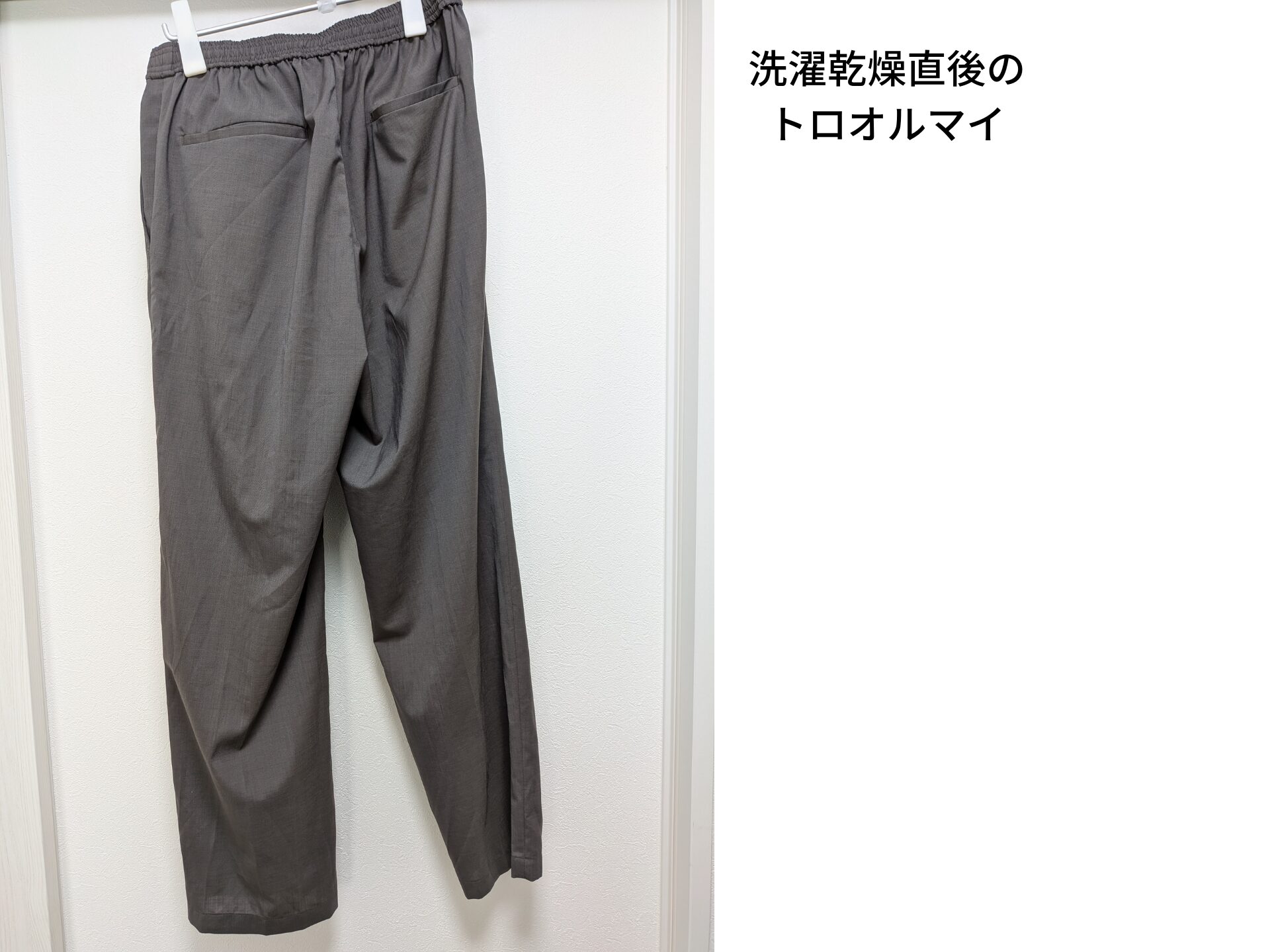 ↑は洗濯乾燥後のトロオルマイの画像です。ポリエステルとウールの混合素材といえ、色味がモカなので、シワが少し残ります。