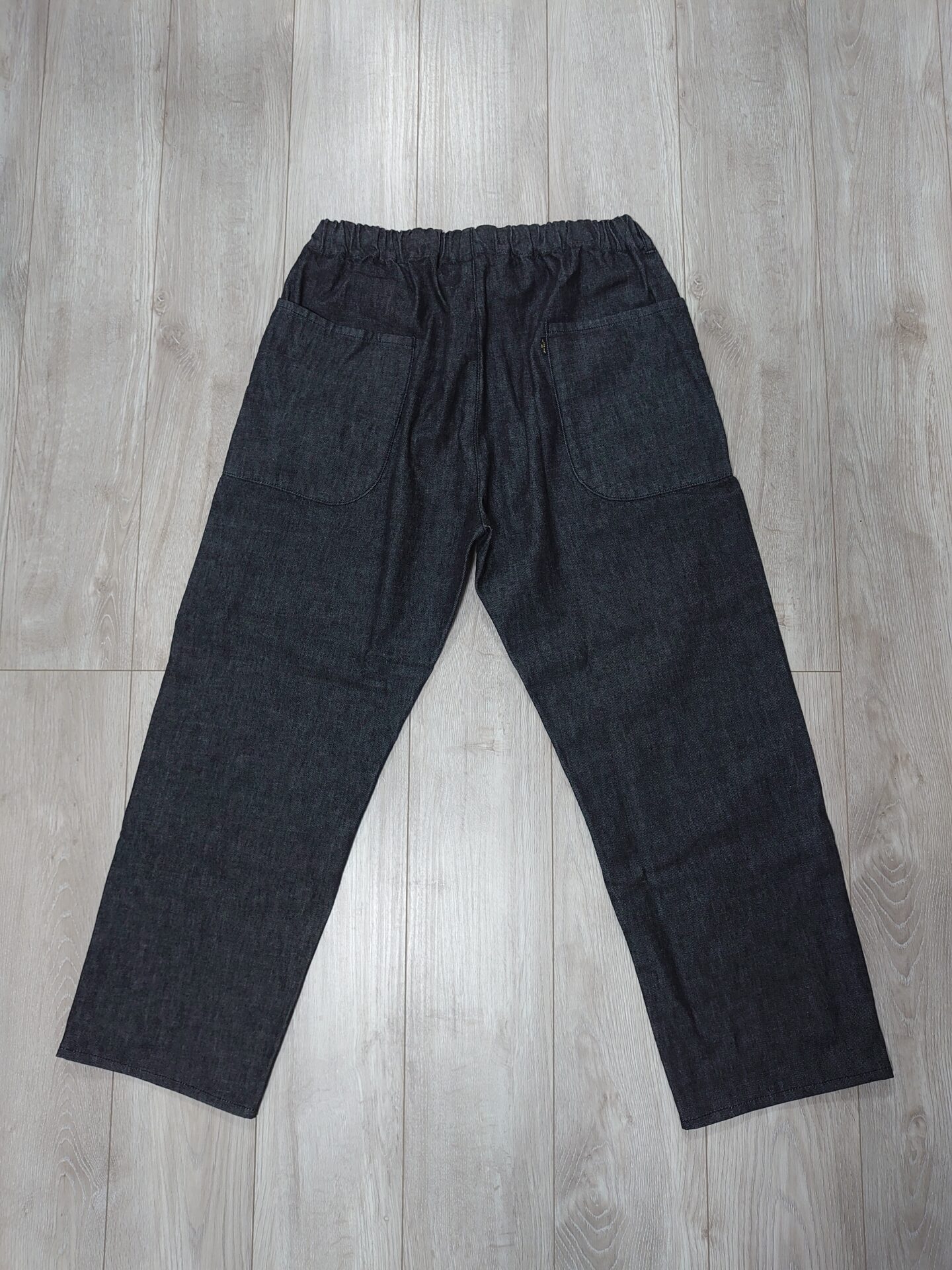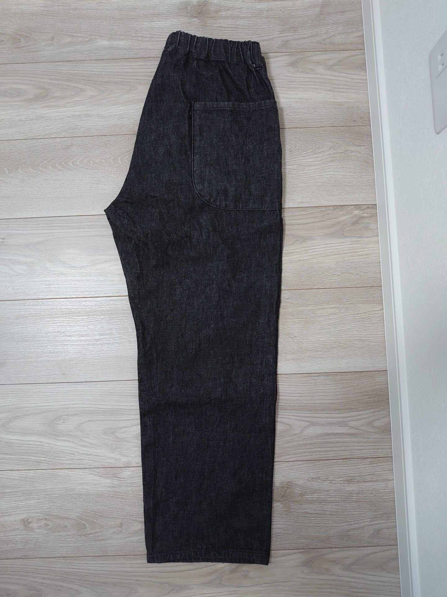 ナウンのブラックデニムは「気楽さと品の良さ」を両立した1本です。ワイドなシルエットとゴム仕様のウエストで穿きやすく、きれいめにもカジュアルにも対応できる万能さがあります。