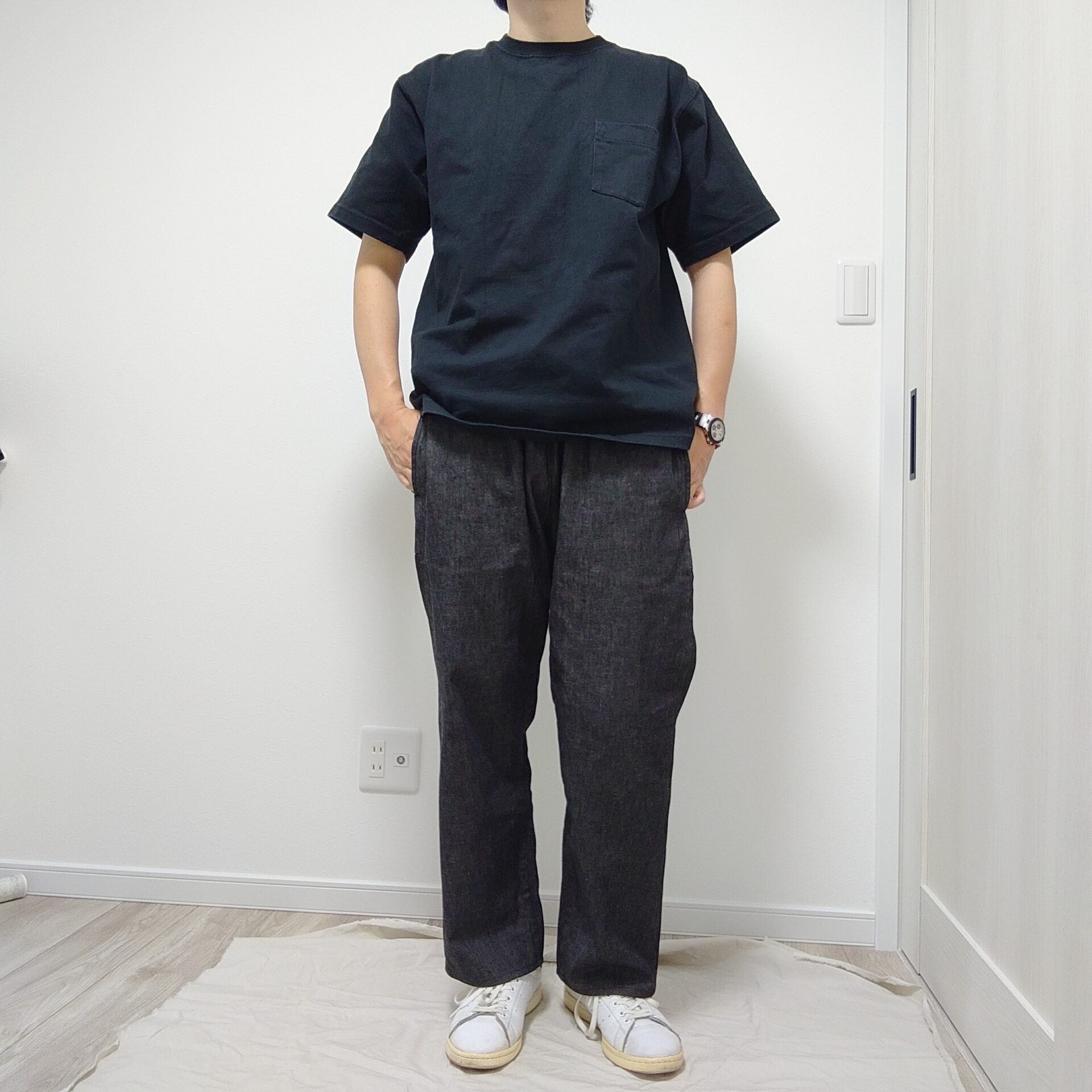 TシャツにはCAMBERを、足元にはスタンスミスを合わせました。CAMBERのブラックとナウンのSPINDLE BLACKでは色味が微妙に異なるため、その差を意識しながらも、スタンスミスのホワイトを差し色として効かせています。