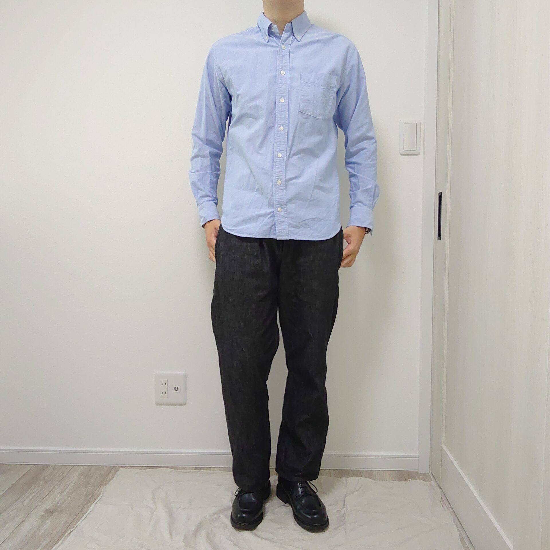 SEROのオックスフォードシャツとSPINDLE BLACKを合わせてみました。足元にはシャンボードを選択し、下半身をブラックに統一。シャツのサックスブルーを強調するコーデにしました。