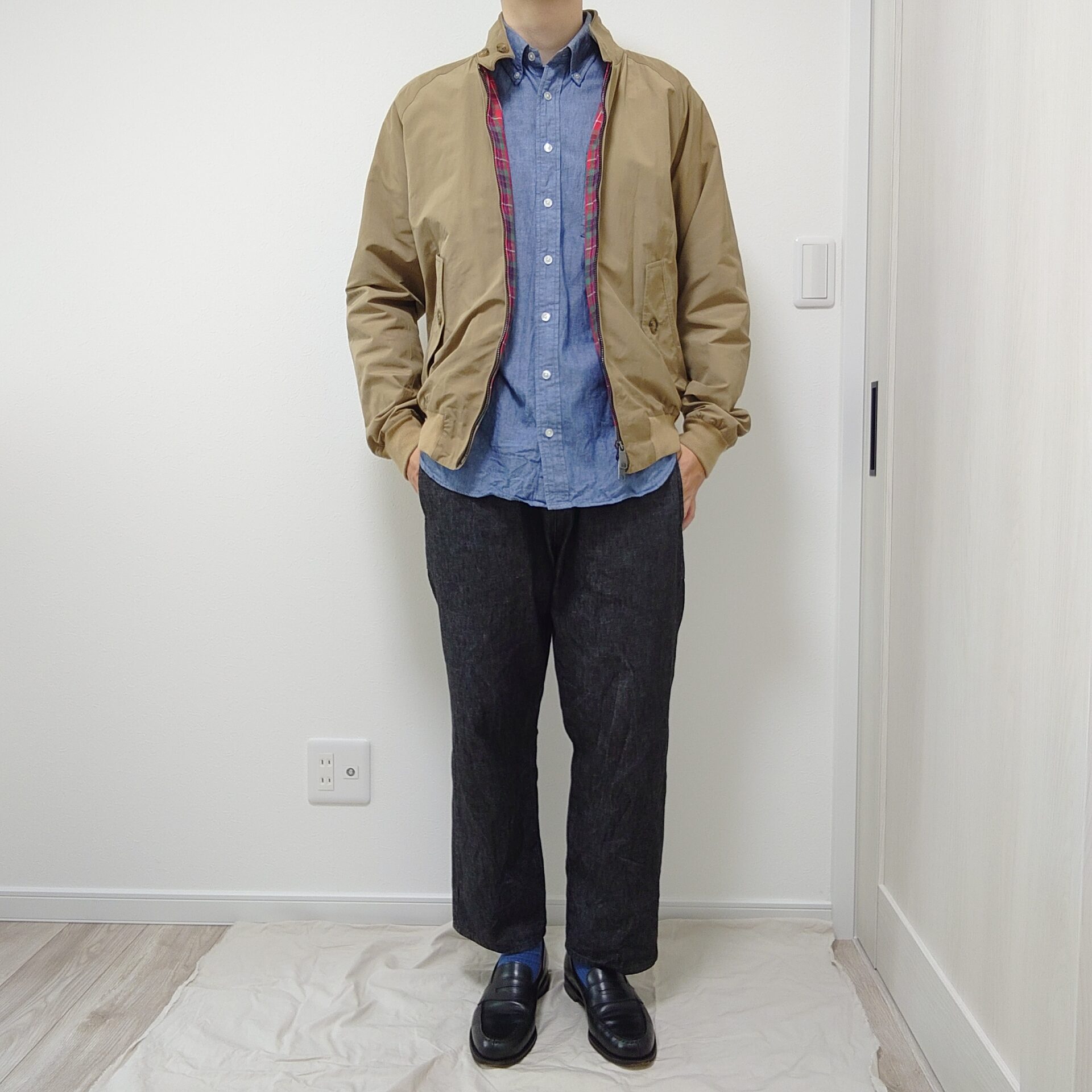 バラクータG9のタンカラーにシャンブレーシャツを合わせ、ブラックデニムにはジャランスリウァヤのローファーを。ベージュとブルーの軽快さに、黒の引き締めが効いたスタイリングです。